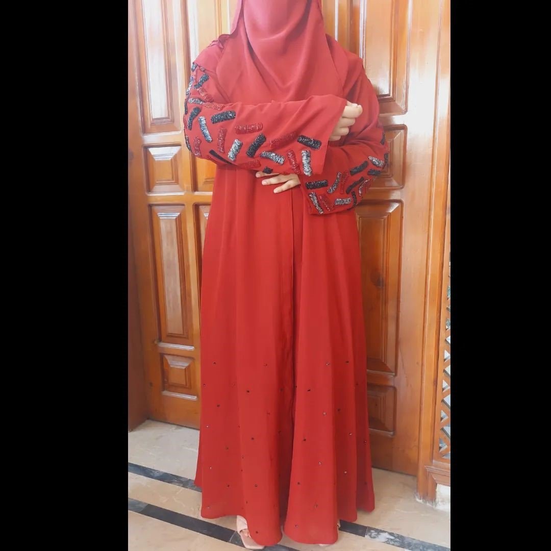 Our abaya, Auburn, of the BORDADÓ series has a soft Georgette texture in the shade of reddish maroon. It’s delicate cutdana work on sleeves along with beads work on the front bottom really makes it stand out.