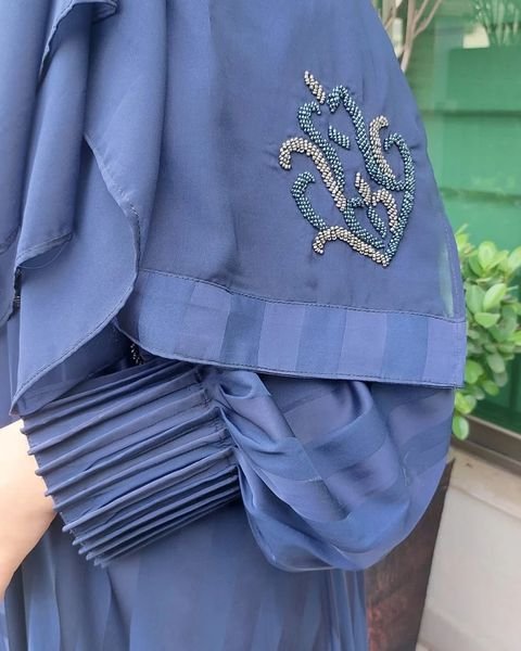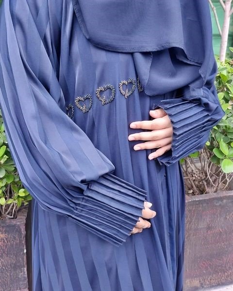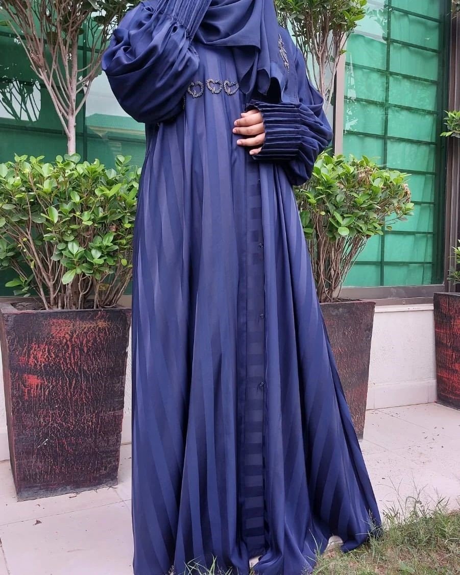 Our unique self print nada silk fabric abaya. The work of our unique self print nada silk fabric abaya. The work of contrasting beads and pleated sleeves give our abaya it’s glamorous look.
